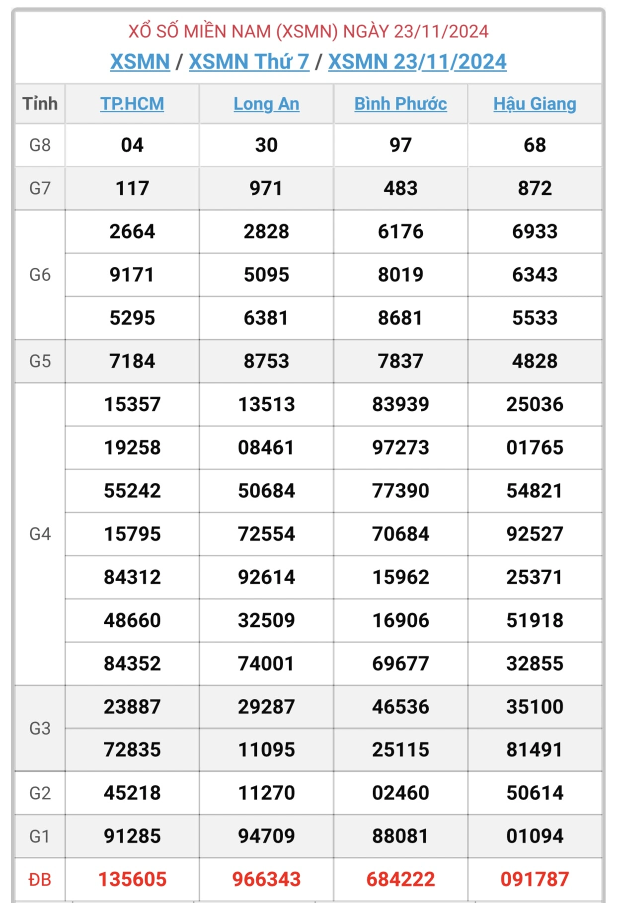 Chốt lô Hồ Chí Minh đặc biệt ngày hôm nay 23/11/2025 như sau: